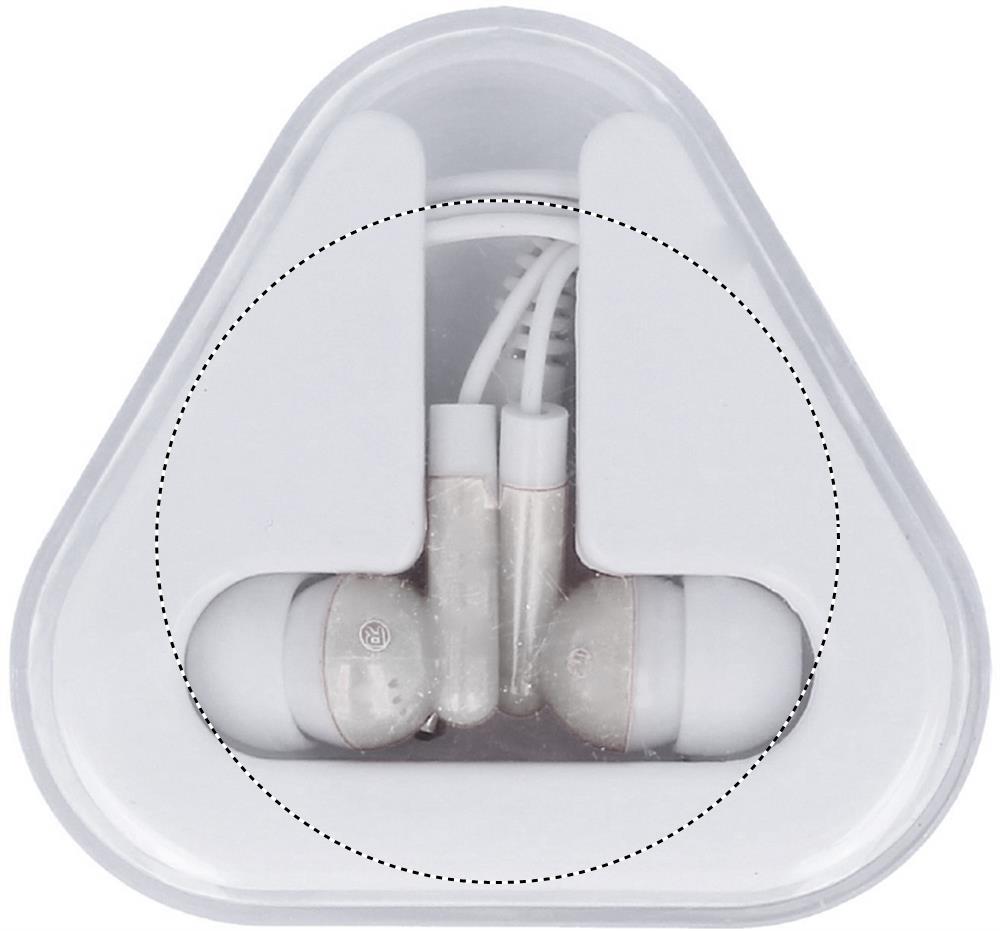 Наушники из ПВХ в треугольном футляре из пластика. Длина кабеля 120 см.