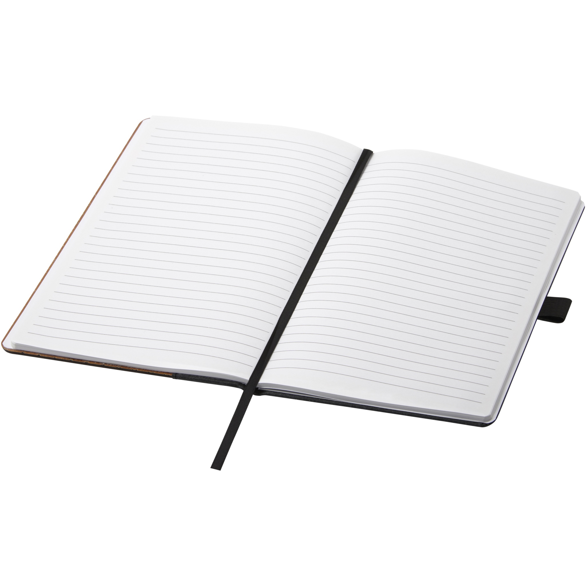Блокнот формата А5 с бамбуковой обложкой и корешком из регенерированной кожи. 80 листов, линованная переработанная бумага плотностью 80 г/м2, черная петля для ручки, эластичная резинка и ленточка-закладка.