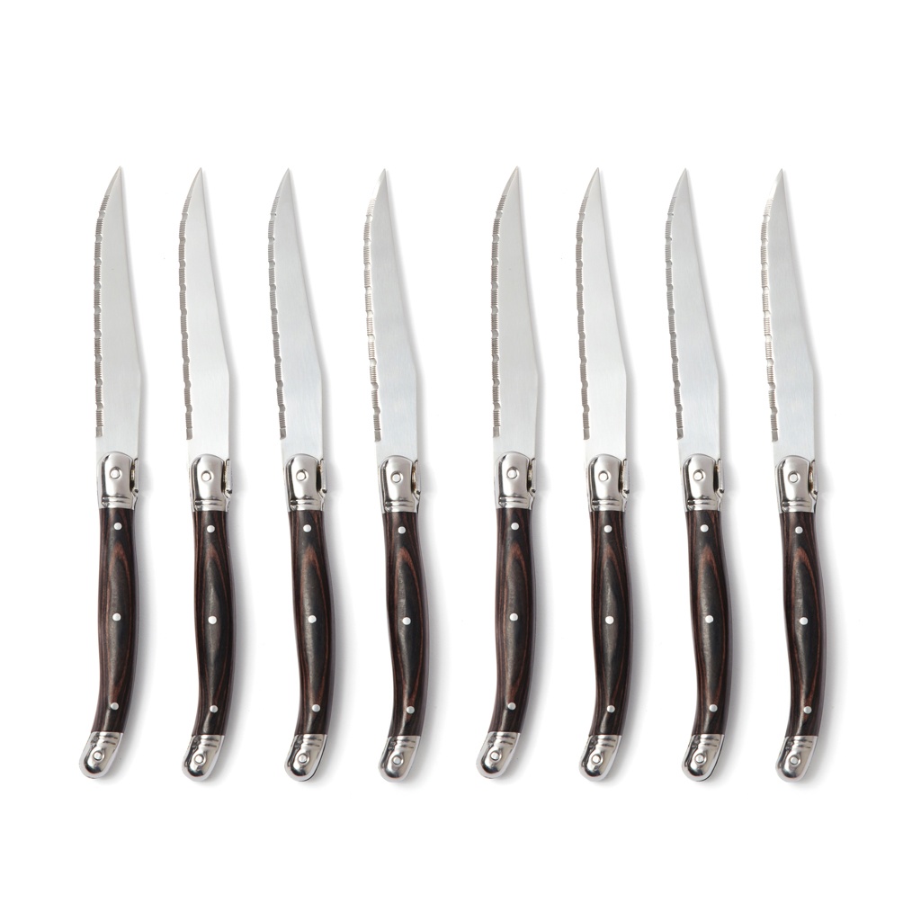 Высококачественные ножи для мяса в типичном стиле французского бистро. Черная ручка из дерева пакка и высококачественные лезвия из нержавеющей стали. Лезвие имеет тонкую решетку, которая позволяет резать пищу с минимальным сопротивлением. Набор из четырех ножей, которые вы легко сможете сочетать с вилками дома. Упакован в эксклюзивную подарочную коробку.