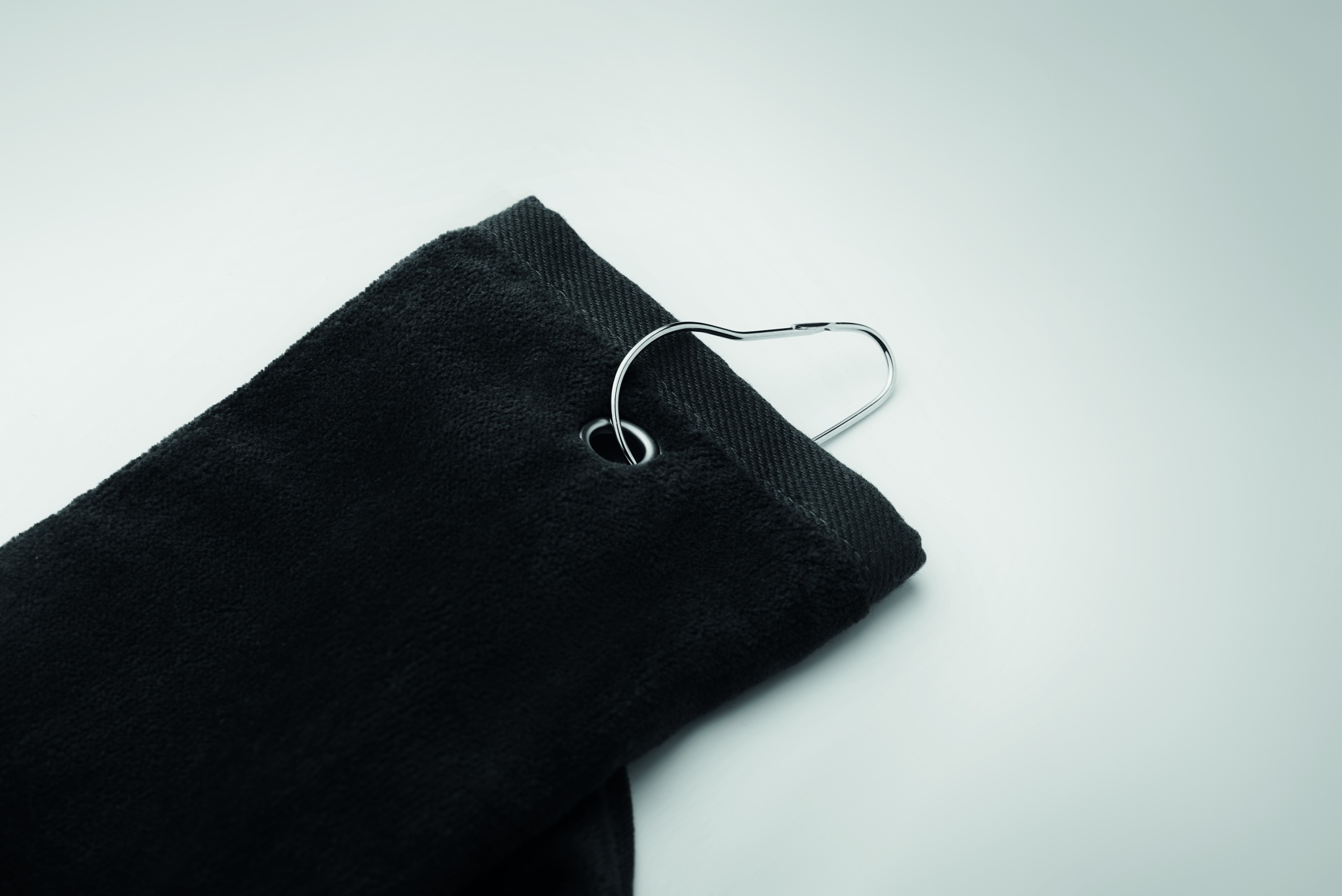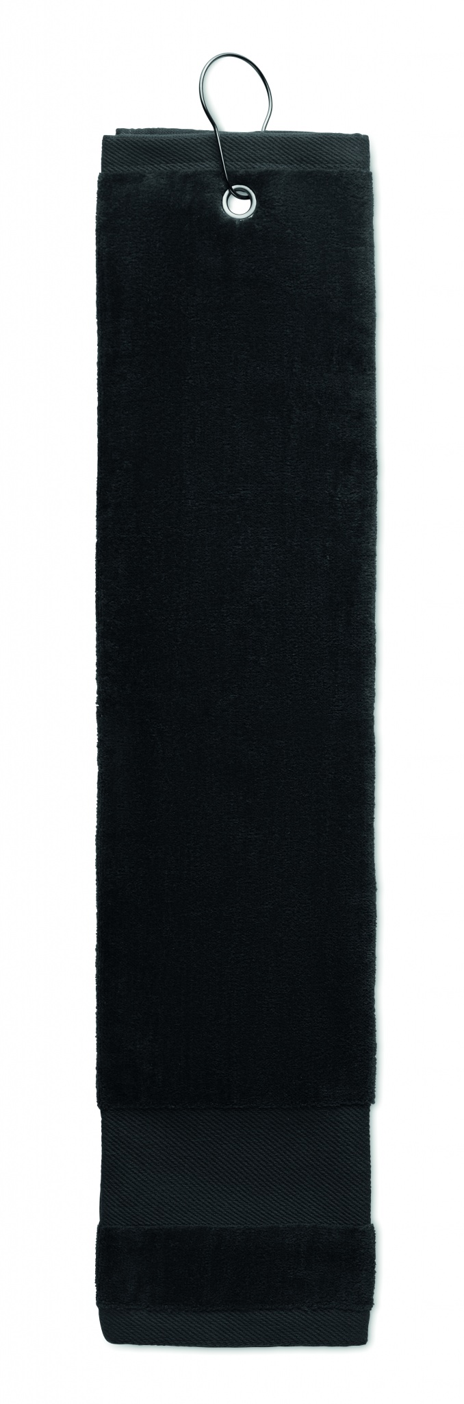Хлопковое полотенце для гольфа с медным кольцом-вешалкой. 350 гр/м². Размер полотенца: 40x60 см.