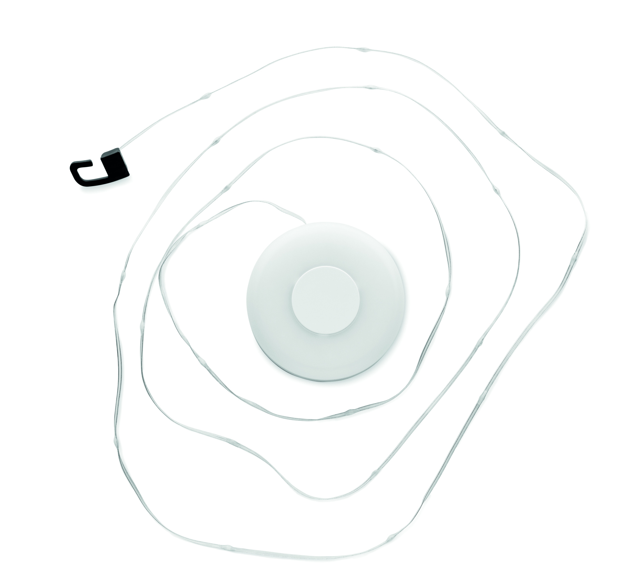 Retractable LED string light in ABS. Includes a rechargeable type-C cable and 1000 mAh battery. 5 light settings. Can be used as portable (hanging) lamp. Cable length: 8 metres.