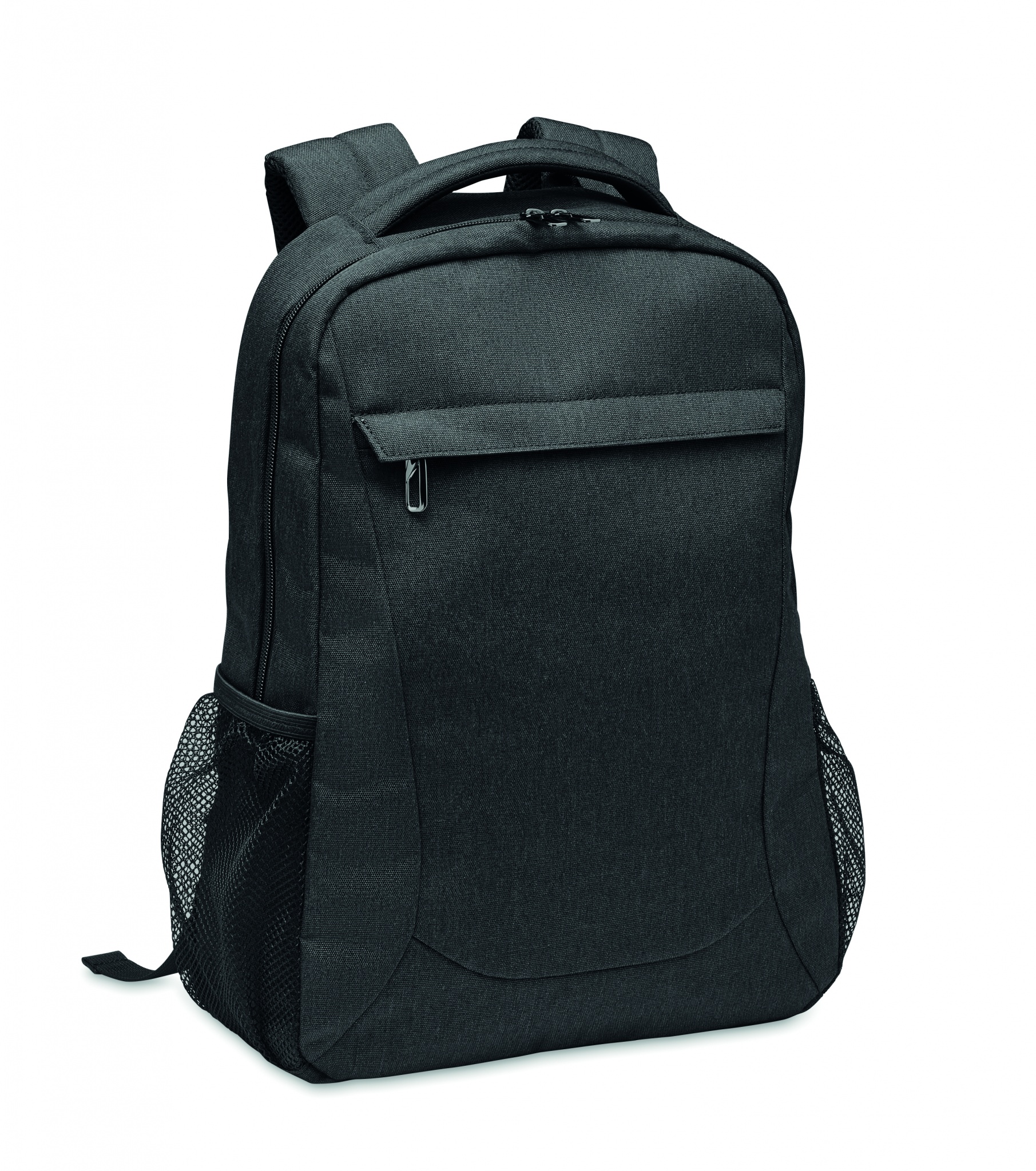 Рюкзак для ноутбука 15 дюймов из полиэстера 600D RPET. Внутреннее отделение для ноутбука и несколько маленьких внутренних отделений. Имеет передний карман на молнии и 2 боковых сетчатых кармана. Регулируемые плечевые ремни. Держатель для чемодана на обратной стороне.