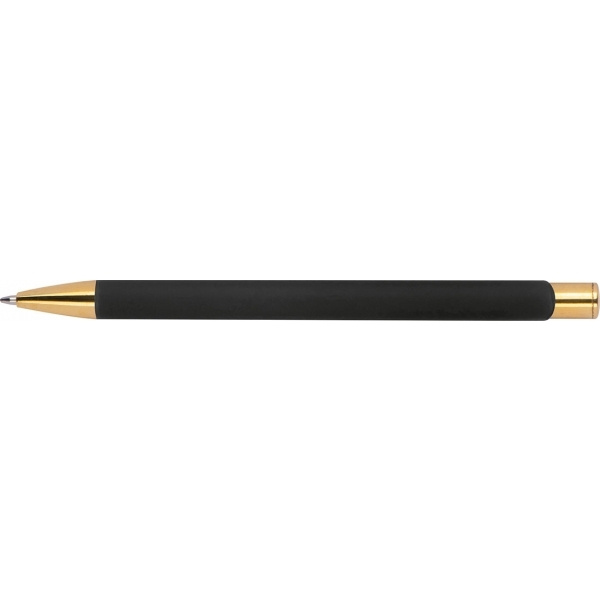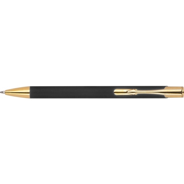 Шариковая ручка из алюминия с золотыми аппликациями, резиновым покрытием и синим стержнем большой емкости. Ваш логотип будет нанесен лазером на правую сторону зажима, он будет золотистого цвета.