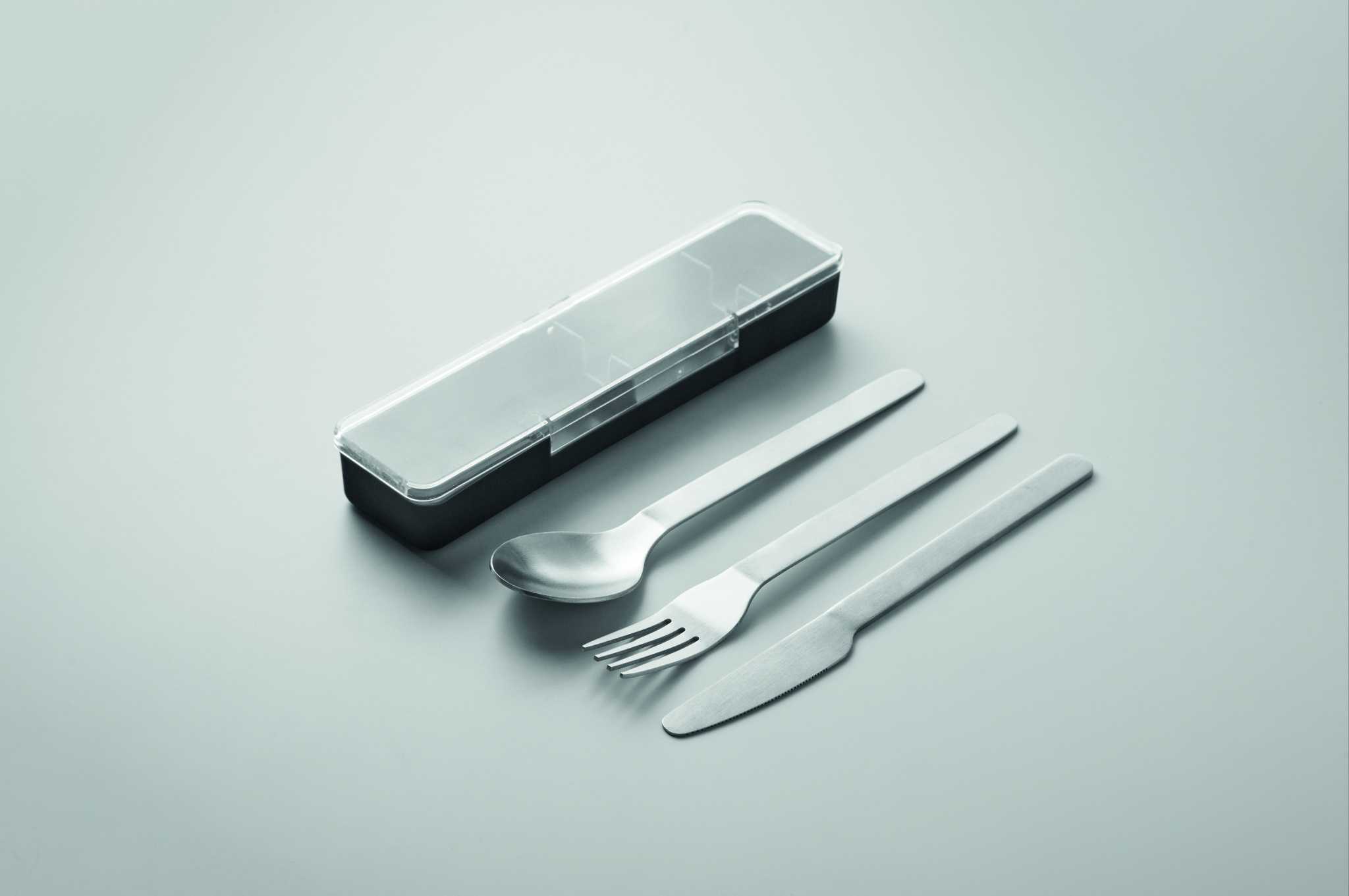 Stainless steel cutlery set with PP case. This set includes a fork, knife and spoon.