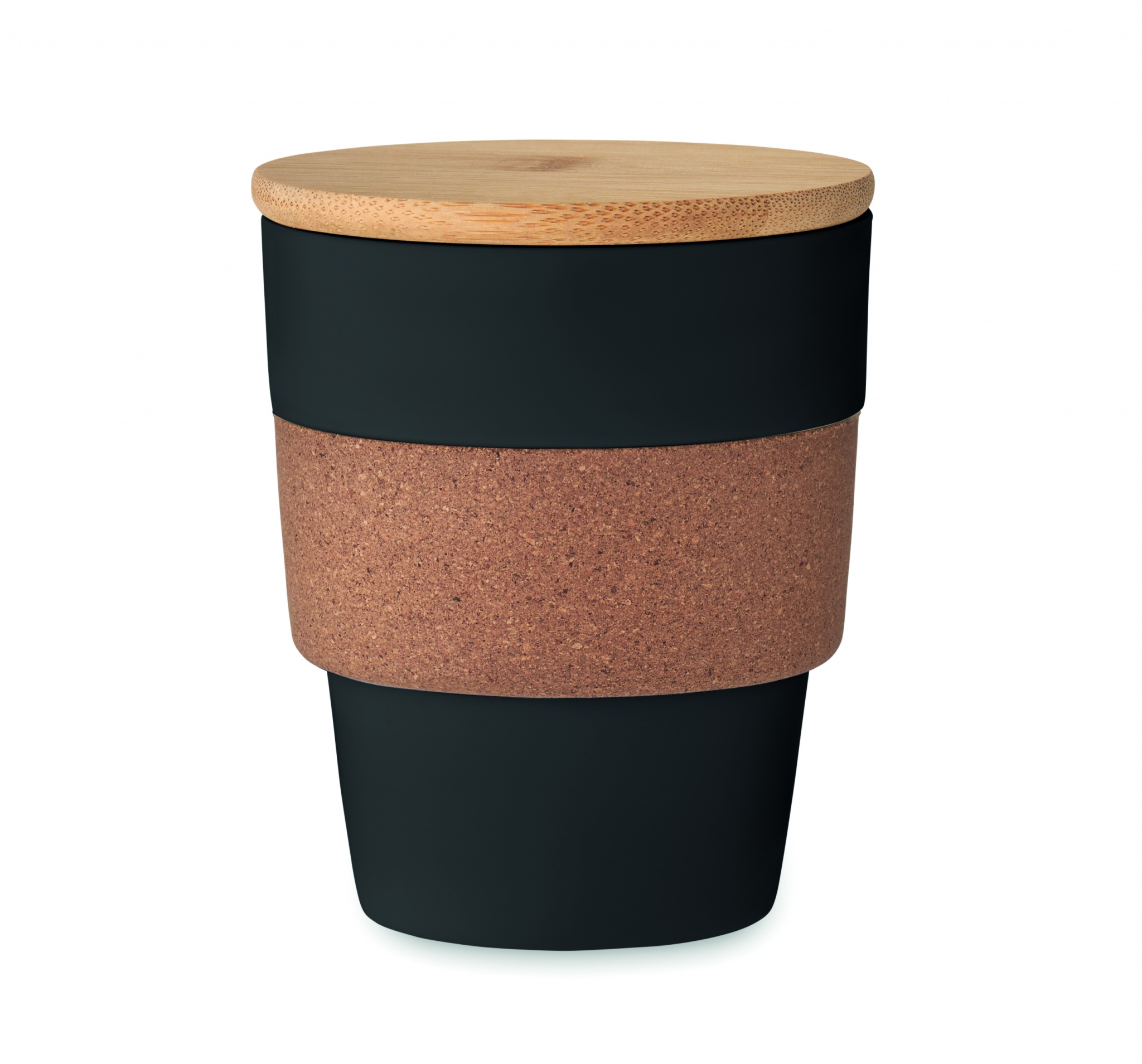 Одностенный стакан из переработанного полипропилена с пробковой защитной вставкой и бамбуковой крышкой. Объем: 300 мл. Возможна частичная теплопередача.