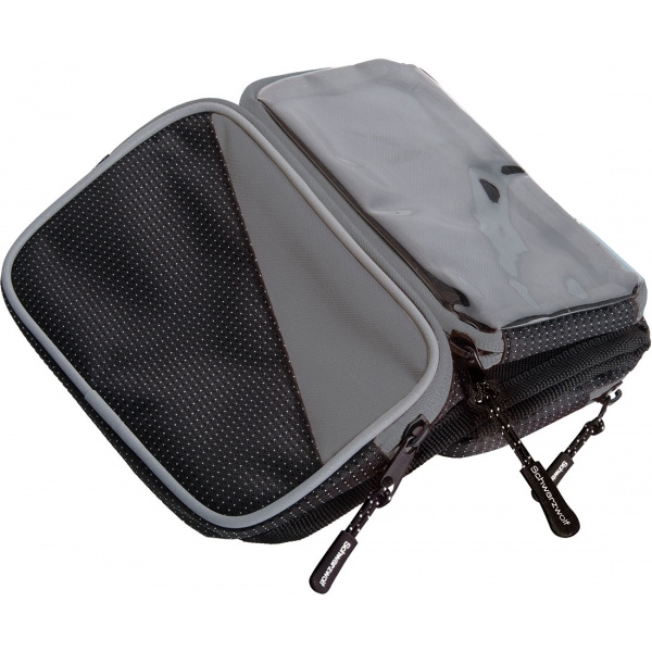 Компактная сумка для велосипеда Schwarzwolf с карманом для телефона. Сумка имеет два боковых кармана на молнии и прозрачный съемный карман для телефона. Внутренние размеры сумки: 8 x 16,5 x 2 см. Упакована в коробку Schwarzwolf.