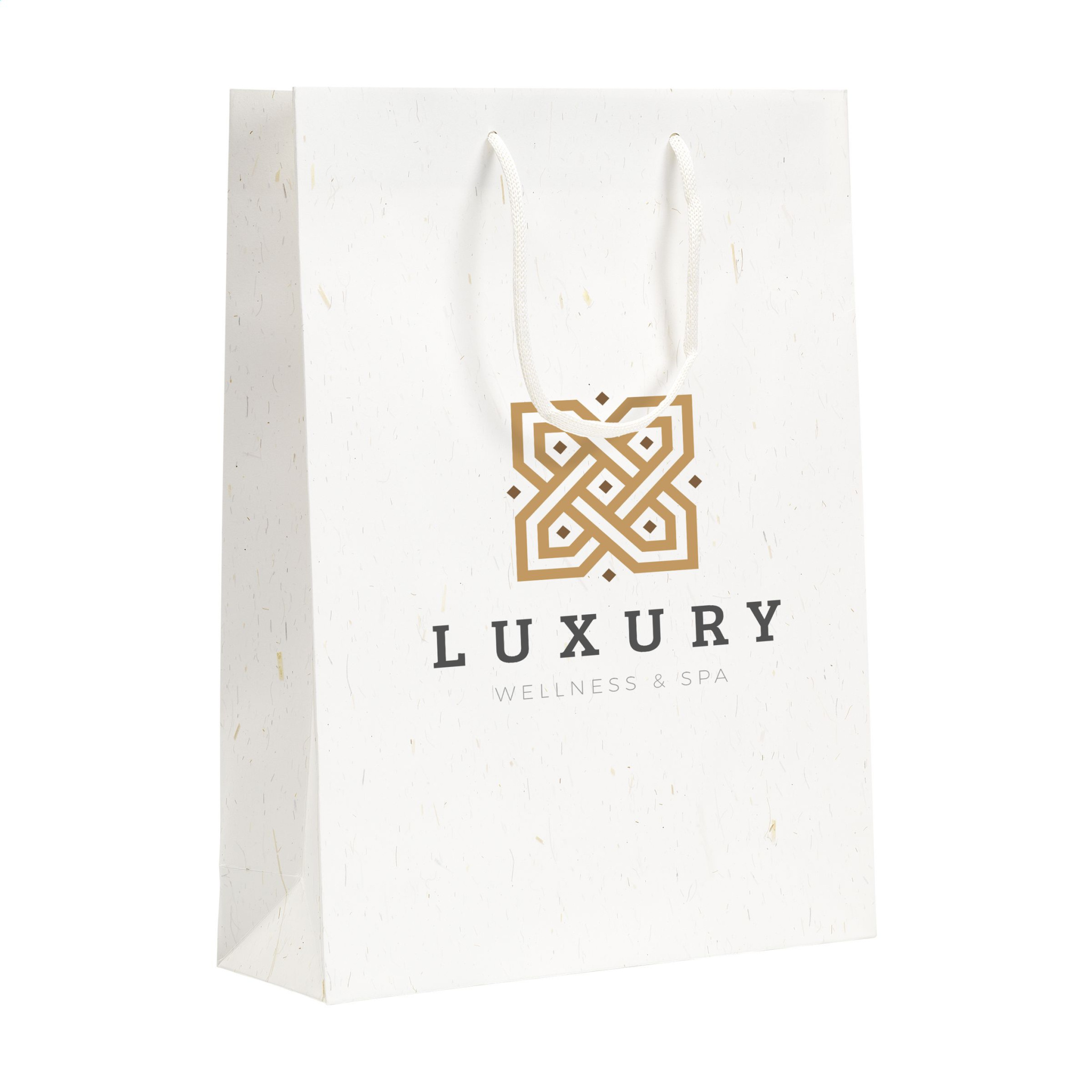 WoW! Прочный подарочный пакет из ЭКО-бумаги (размер L) из переработанной бумаги с соломенными волокнами (180 г/м²). Благодаря использованию натуральных волокон каждый пакет уникален, а неровности бумаги видны. Это придает изделию красивый естественный вид. Каждый пакет имеет две короткие бумажные плетеные петли для переноски, сложенное дно и боковую складку. Подходит для всех видов рекламных целей. Для производства этого пакета не вырубаются деревья.