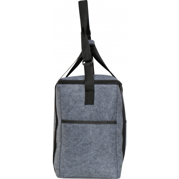 Очень большая сумка-холодильник из переработанного войлока. Имеет большое основное отделение, три внешних накладных кармана, две ручки для переноски и регулируемый плечевой ремень.