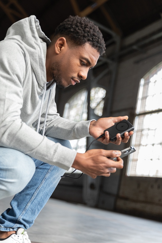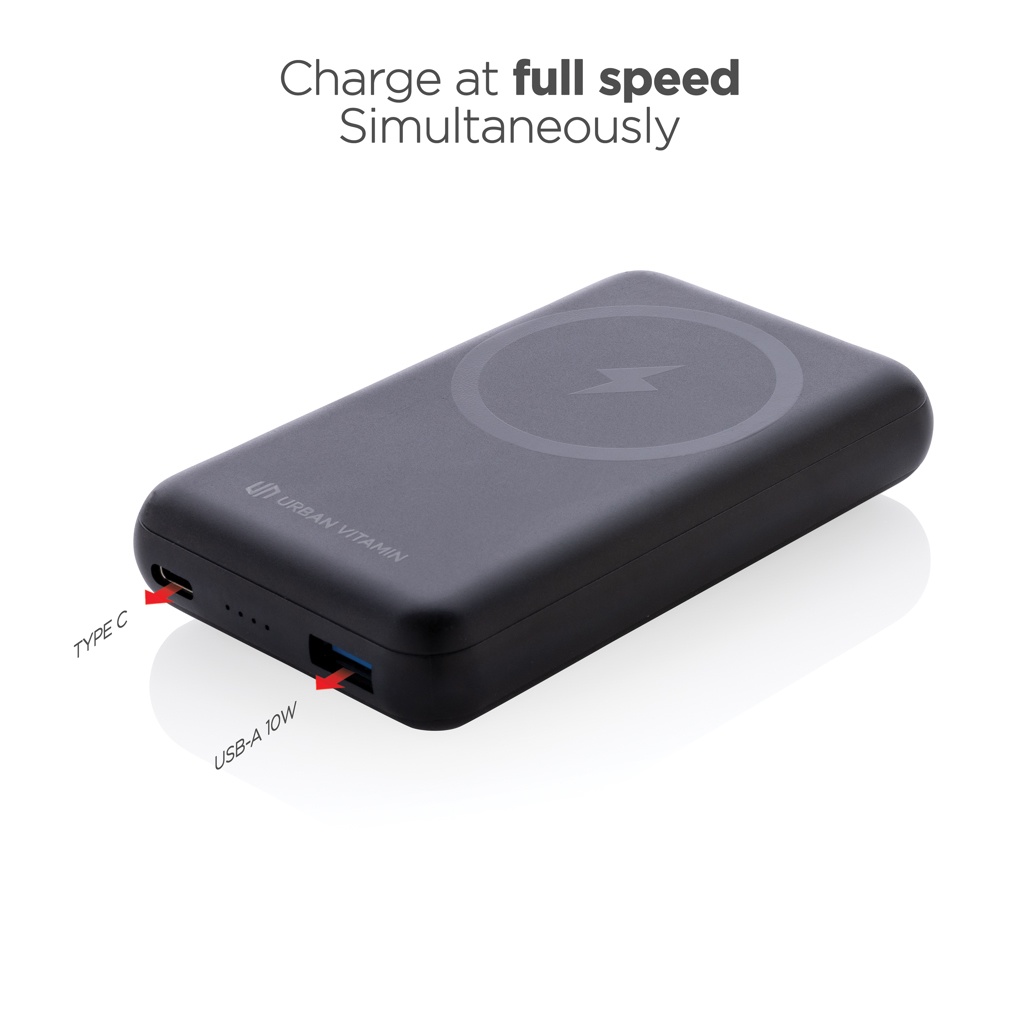 Заряжайте свой телефон до 2,5 раз с помощью этого быстрозарядного внешнего аккумулятора. Тонкий и компактный внешний аккумулятор оснащен встроенным быстрым беспроводным магнитным зарядным устройством мощностью 10 Вт. Имеет универсальную встроенную складную подставку, которая удерживает ваш телефон в вертикальном положении для удобного угла обзора. Благодаря сверхбыстрому порту PD типа C внешний аккумулятор заряжается за рекордное время. Зарядка телефона до 50% занимает всего 30 минут. Медленная зарядка осталась в прошлом. Внешний аккумулятор содержит долговечную батарею класса А емкостью 10 000 мАч для зарядки всех ваших устройств во время путешествий и приключений. Двойной выходной порт A и тип C позволяют заряжать до 2 устройств одновременно. Изготовлен из сертифицированного переработанного АБС-пластика RCS (Recycled Claim Standard) Общее содержание переработанных материалов: 16 % от общего веса товара. Сертификация RCS гарантирует полностью сертифицированную цепочку поставок переработанных материалов. Товары Urban Vitamin изготавливаются без ПВХ и упаковываются в упаковку с уменьшенным содержанием пластика. USB: 5 В 3,0 А Тип C: 5 В 3,0 А, 9 В 2,22 А, 12 В 1,5 А.