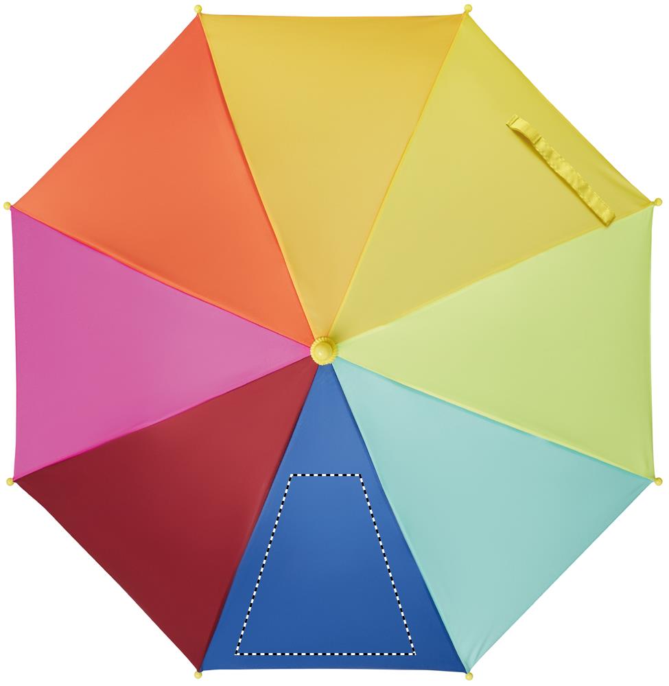 18'' barnparaply i 190T pongee med regnbågsmönster. Det har 8 paneler. Manuell öppning och uppfällning. Ribbor och ram i glasfiber. Handtag och spetsar i plast. Böjt handtag.