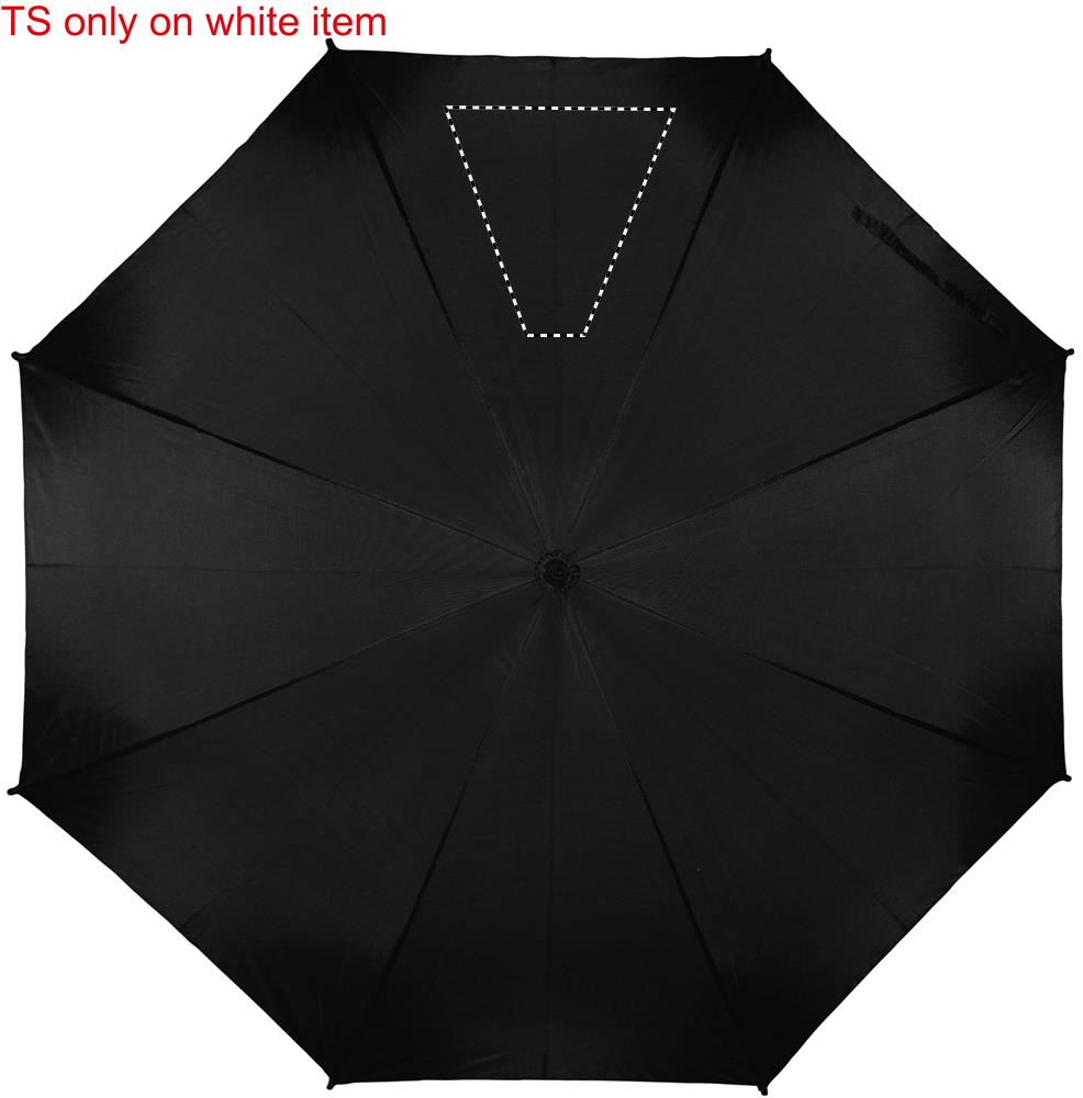 Promenadparaply, 23 tums i 190T polyester med svart pläterat stålskaft och spröt. Svarta plast tippar. Rakt svart handtag i mjukt EVA material. Manuel stängning och automatisk öppning.