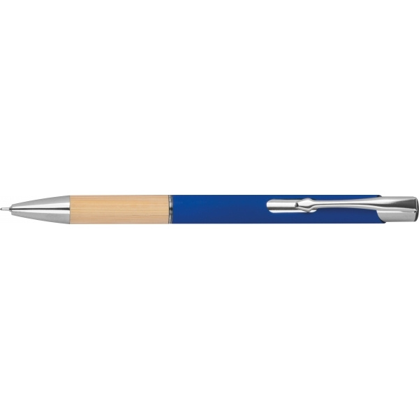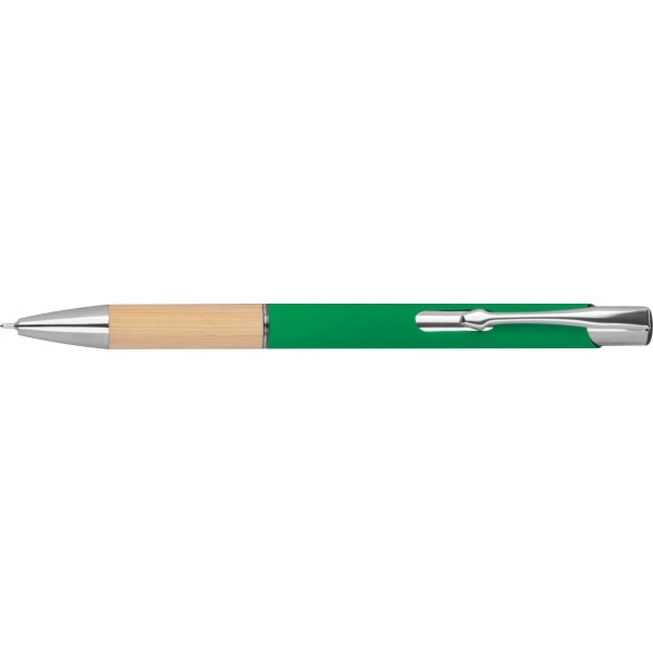 Semi gelpenna gjord av återvunnet aluminium med en yta i gummi. Den har också en bambugreppzon, en blåskrivande plastpåfyllning (0,5 mm spets) och silverdetaljer.