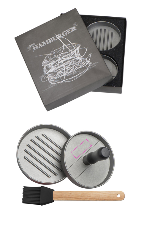 Burgerbiffpress i aluminium med silikonborste, förpackad i en individuell kartong. Vi klistrar din logotyp med en etikett på kartongen.