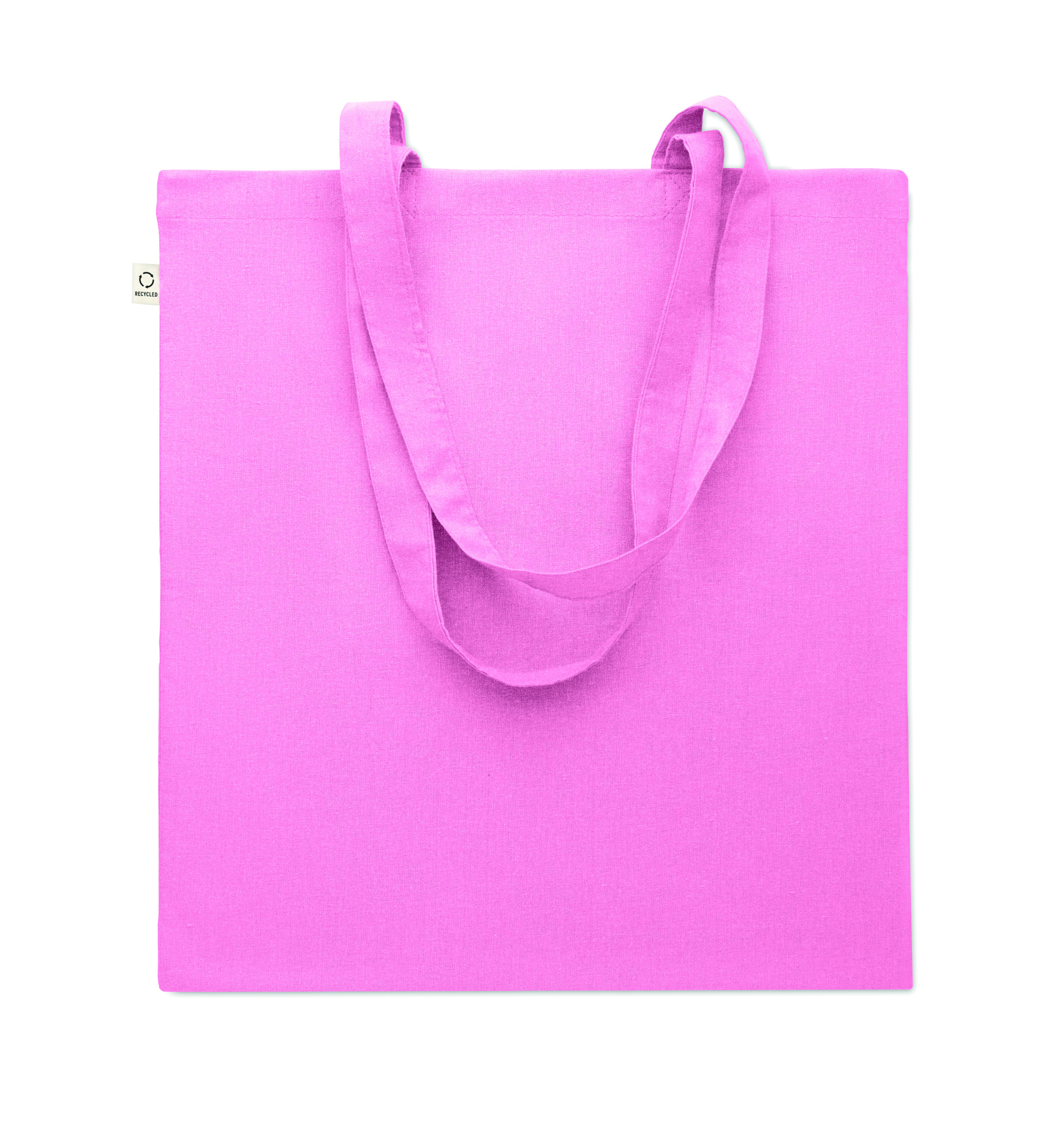Kasse av återvunnen bomull (70% återvunnen bomull och 30% RPET) med långa handtag. 140 gr/m².