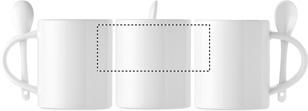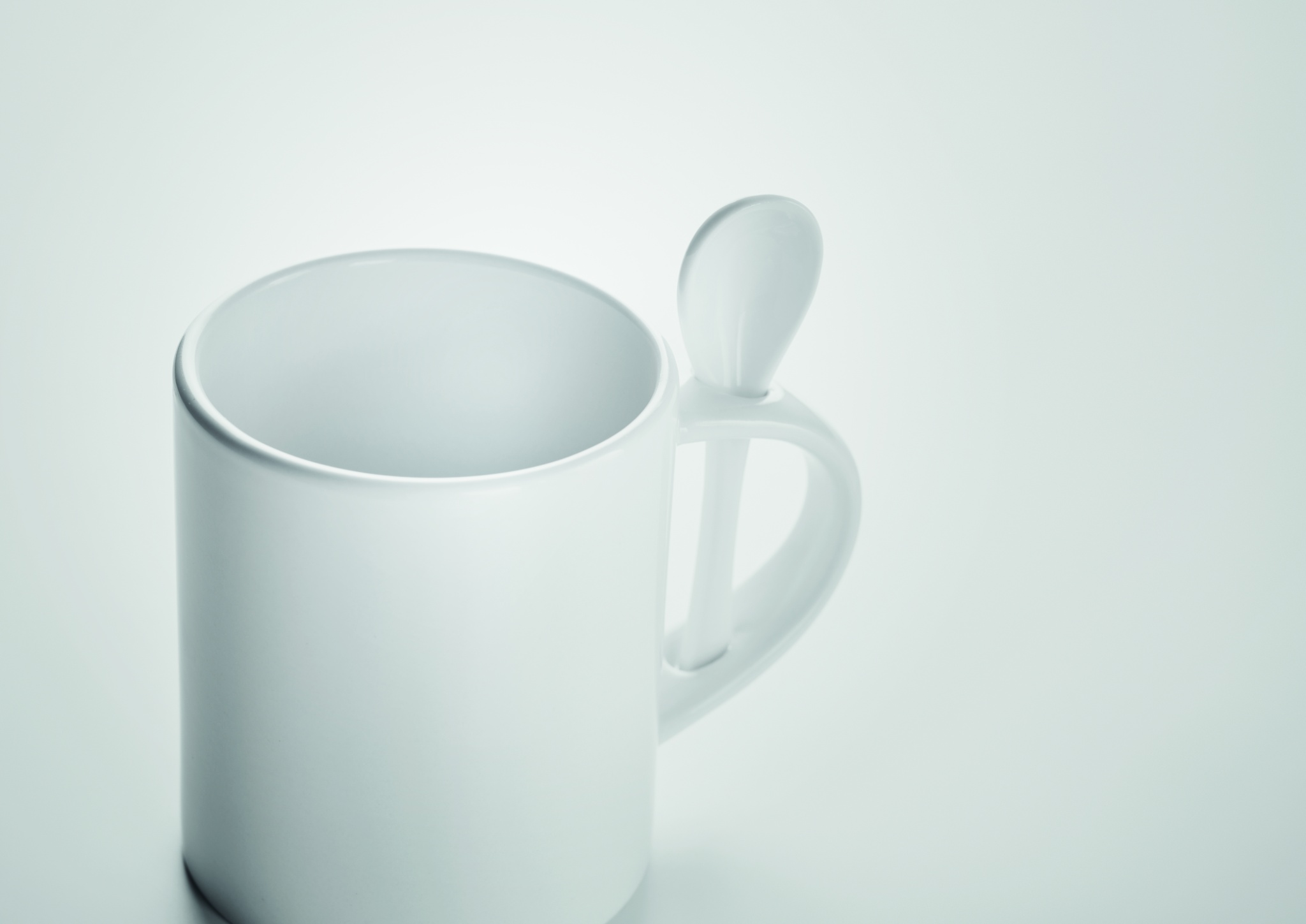 Keramikmugg med sked. Gjord med specialbeläggning för sublimationstryck. Skeden förvaras i handtaget. Kapacitet: 300 ml.