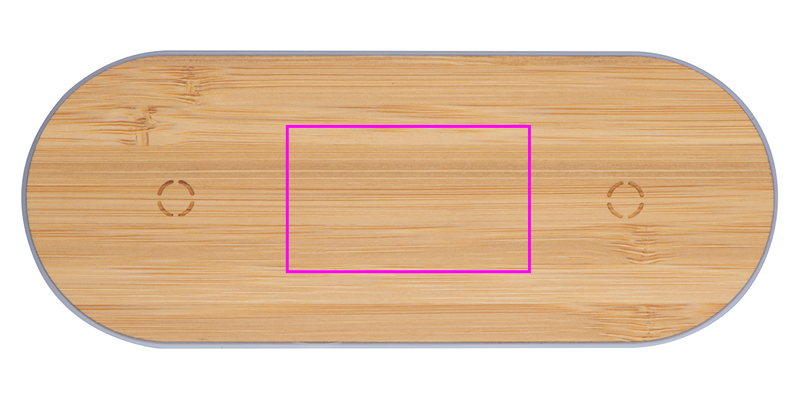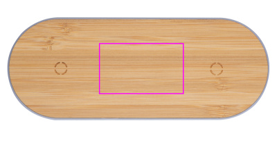 Smal plastladdstation med bambuyta och två induktionsladdningspunkter för smartphones, inklusive en laddkabel. Din logotyp kommer att graveras på stationen.