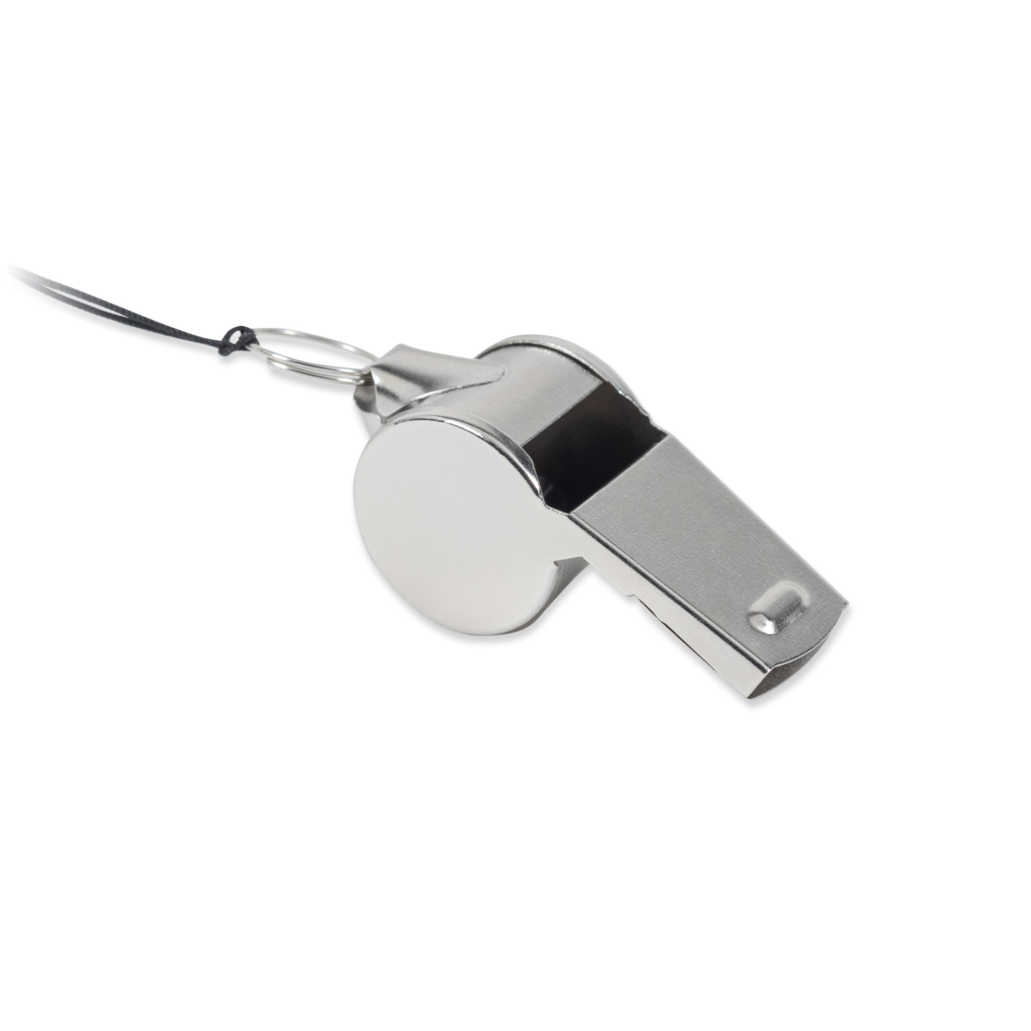 Metall visselpipa fäst vid snodd med säkerhetsspänne.