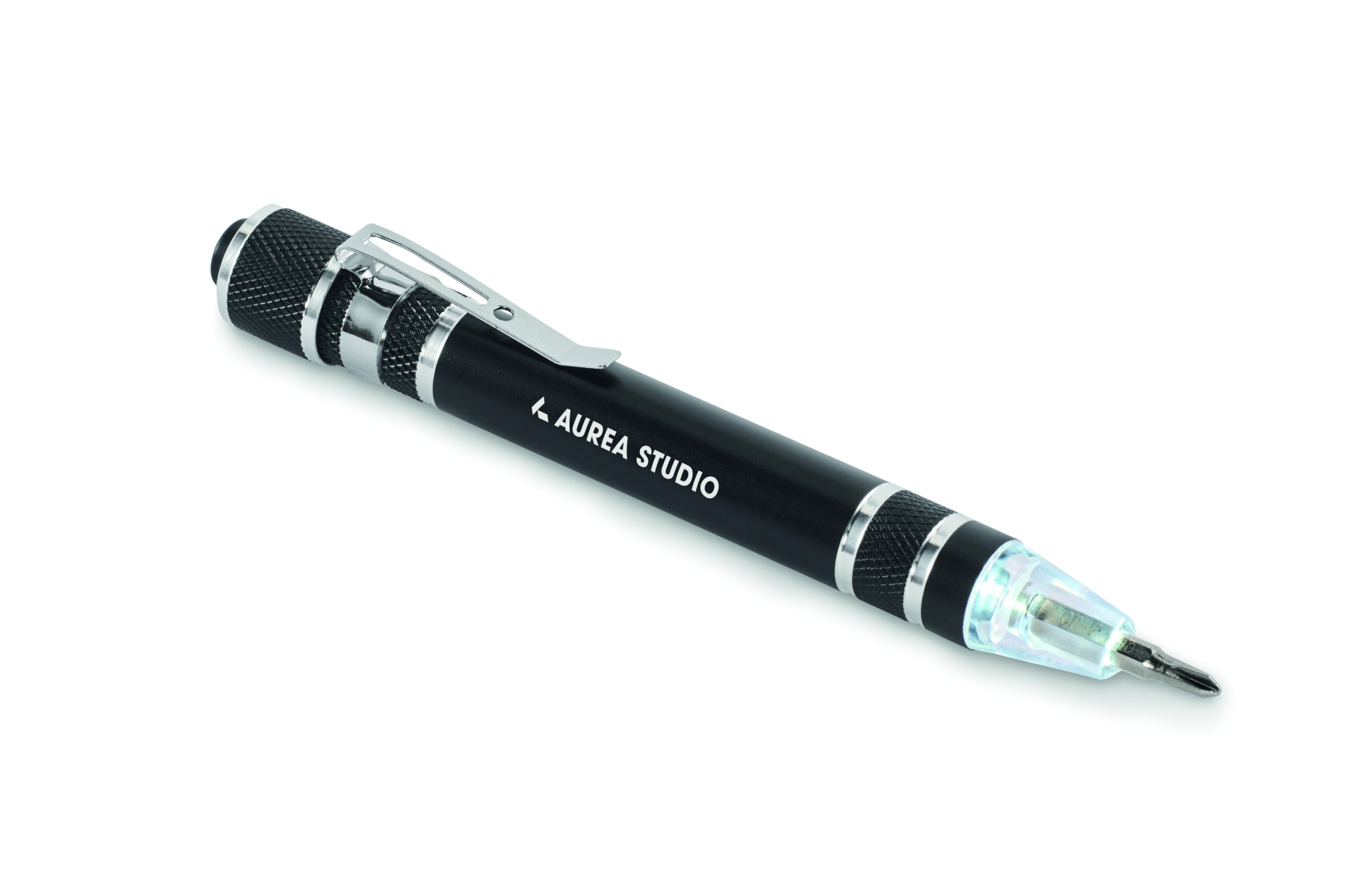 Multiverktyg i återvunnen aluminium i pennform med ficklampa. Innehåller 3 spårskruvmejslar och 3 stjärnskruvmejslar. 4 knappcellsbatterier LR41 ingår.