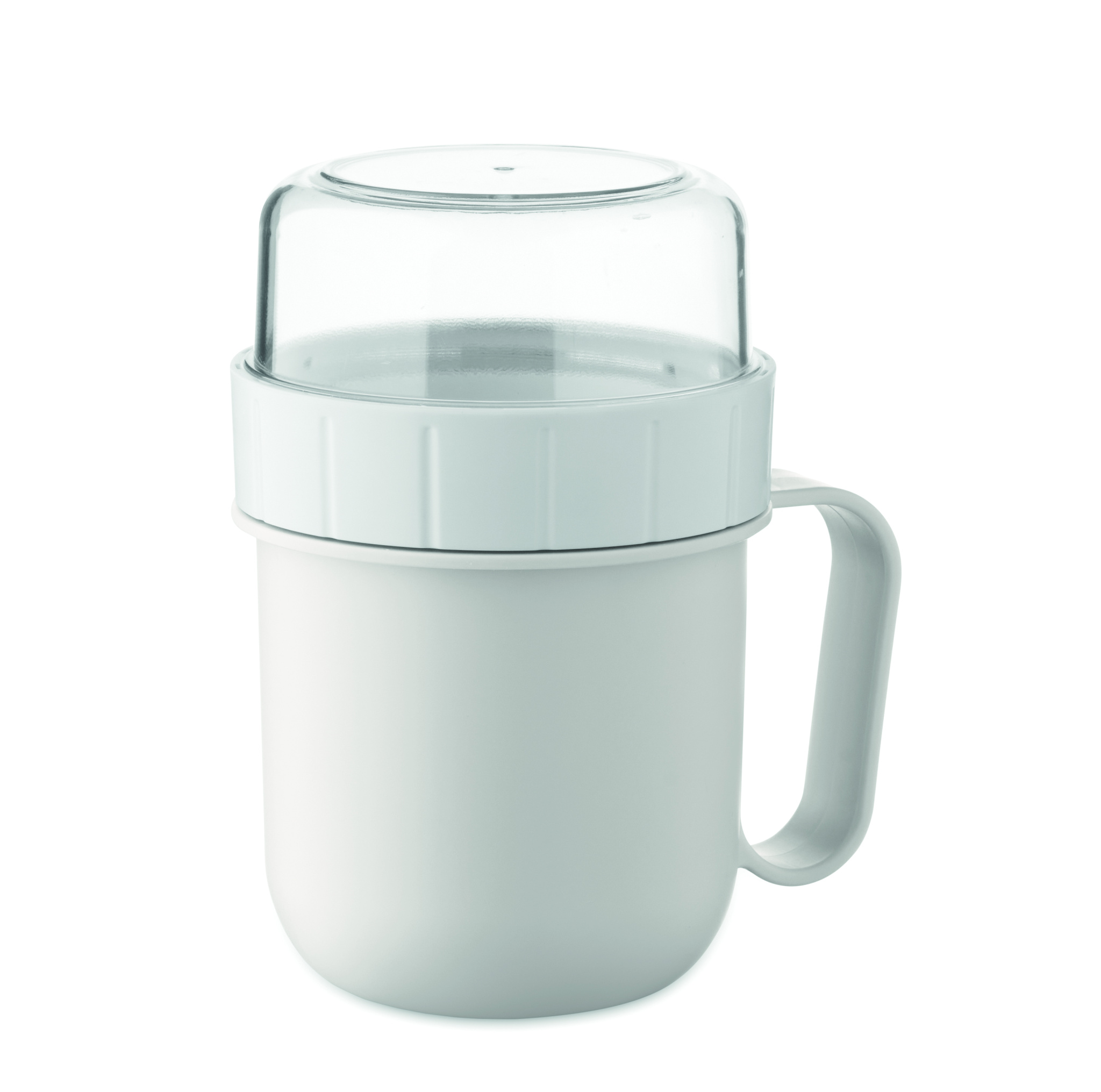 Frukostmugg för människor i farten i PP och PS. Består av 2 individuella behållare för att hålla ingredienserna åtskilda. Volym: 450 ml och 160 ml. Läckagefri.