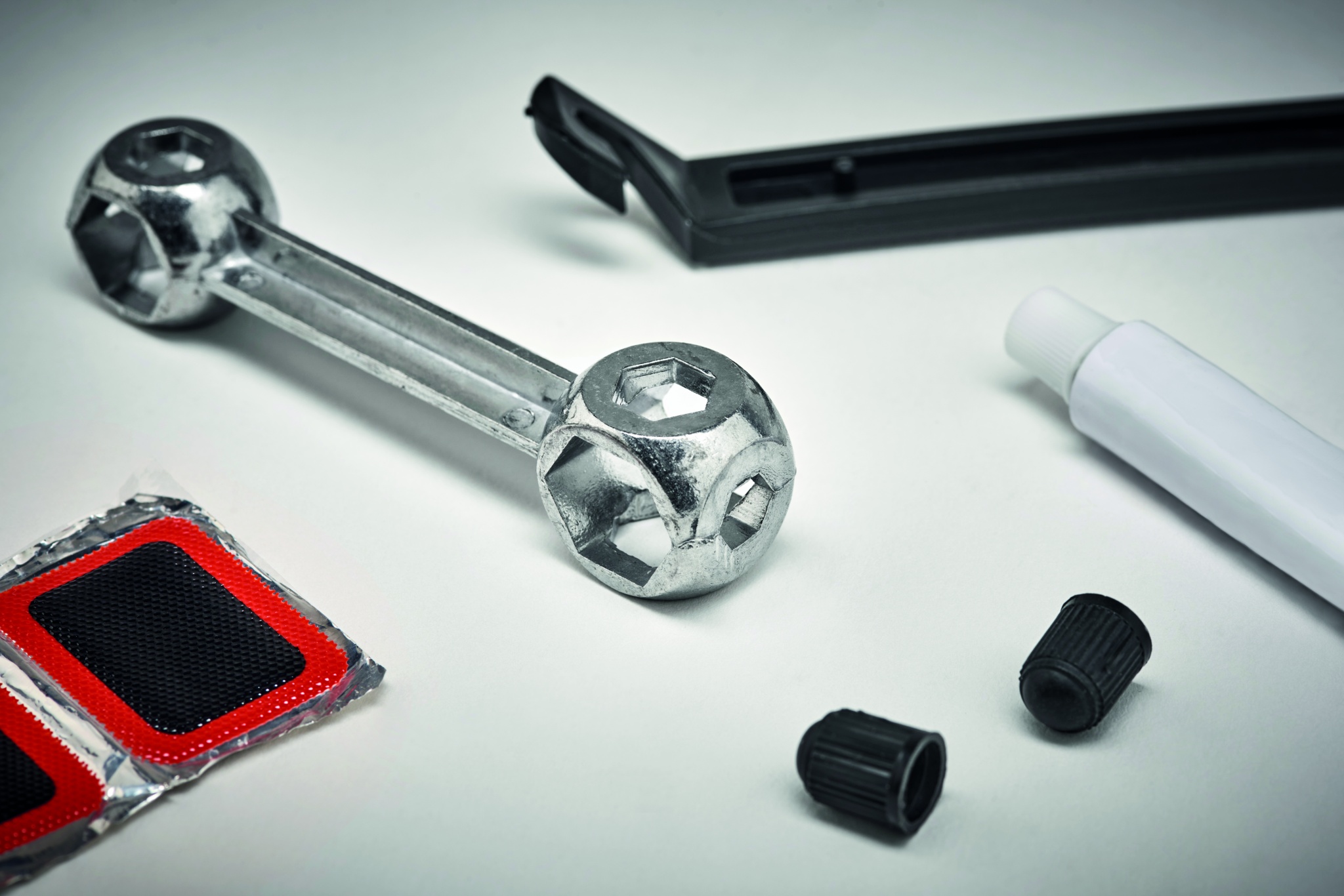 Reparationssats för cykel innehållande sats med 1 skiftnyckel, 2 däckhandtag, 1 lim, 2 ventilhattar, 2 ventiler, 1 slip, 5 reparationsplåster. Kommer i transparent låda.