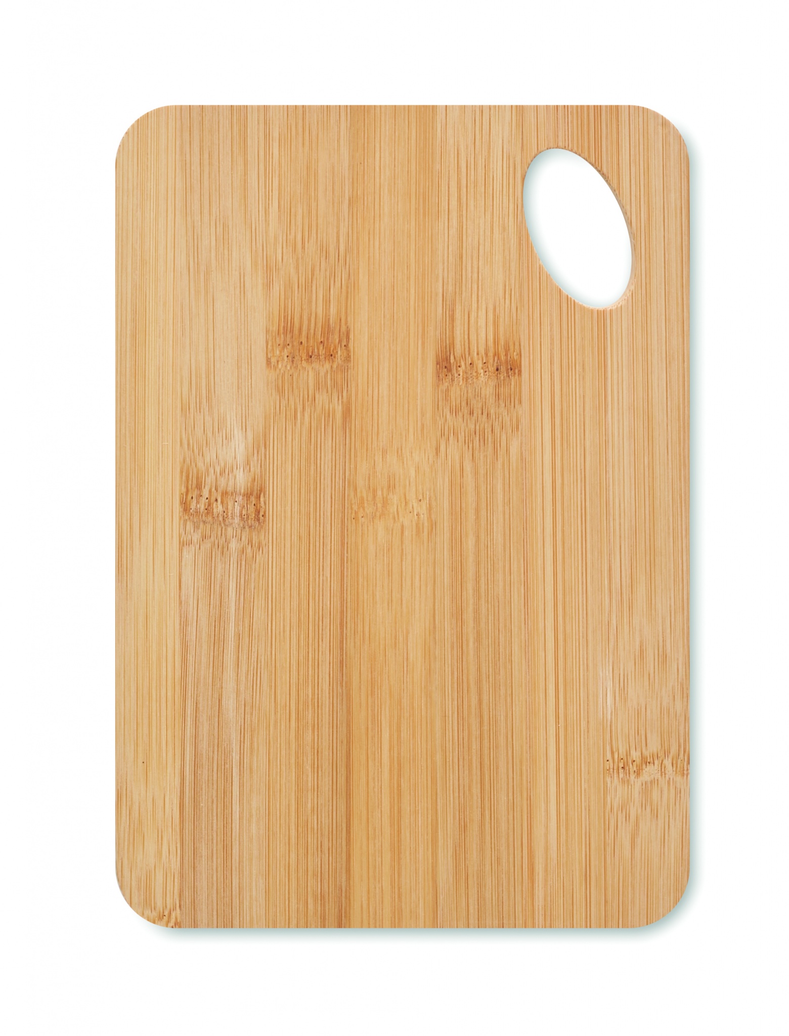 Skärbräda i bambusträ med upphängningshål.