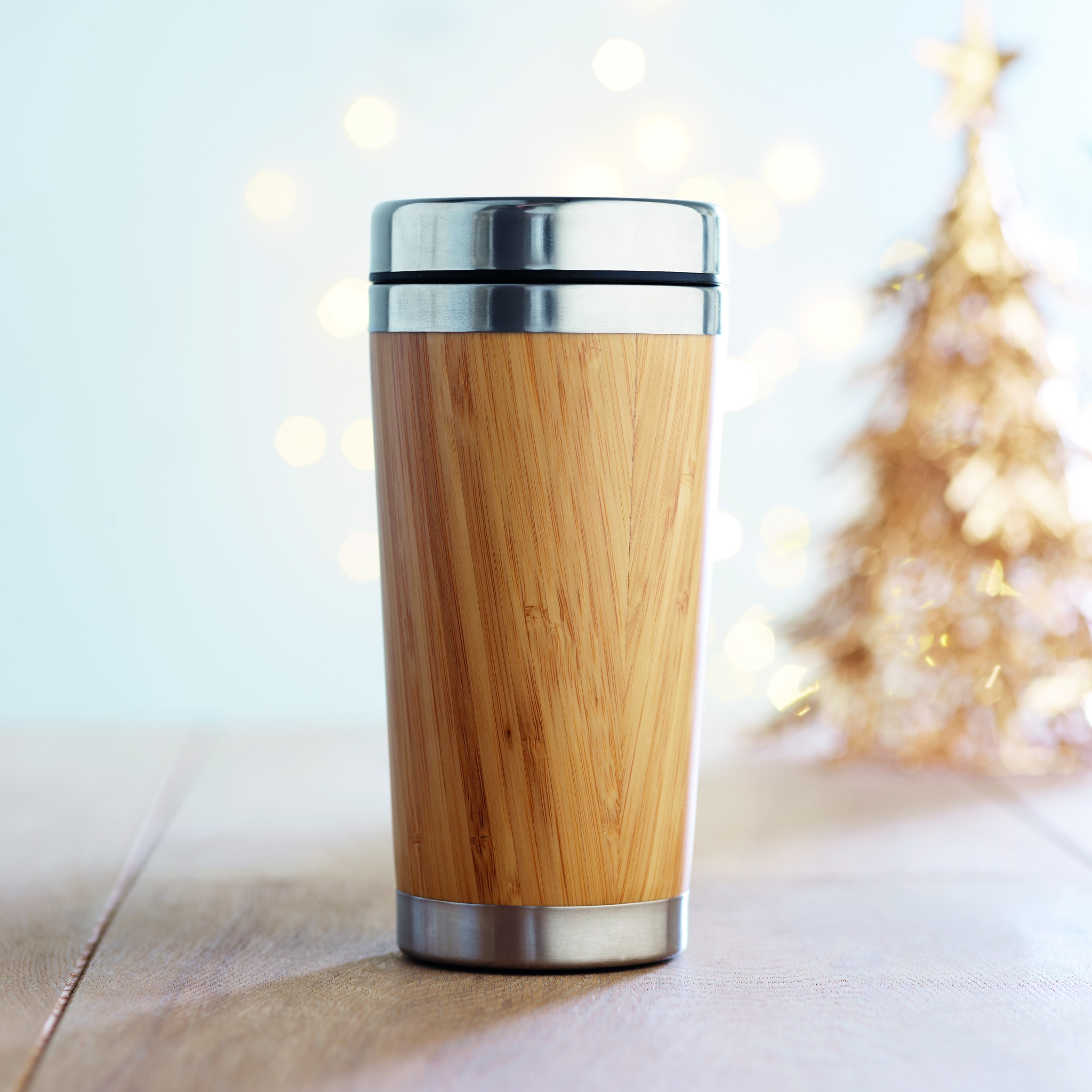 Termosmugg i rostfritt stål med utsida i Bambu. Dubbla väggar för bättre värmeisolering. Fungerar för både varma och kalla drycker. Volym: 400ml.