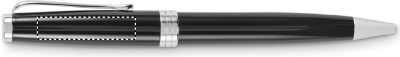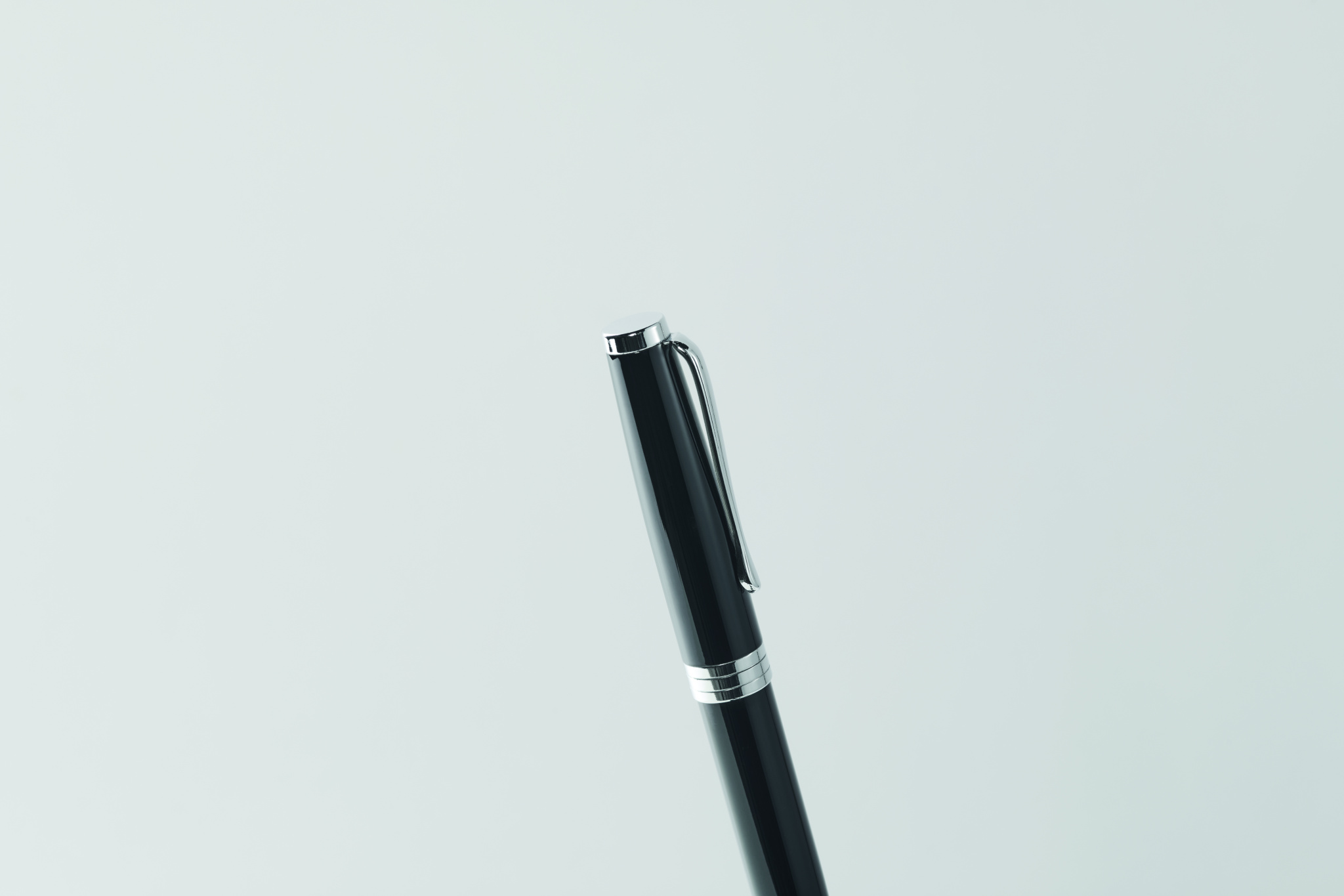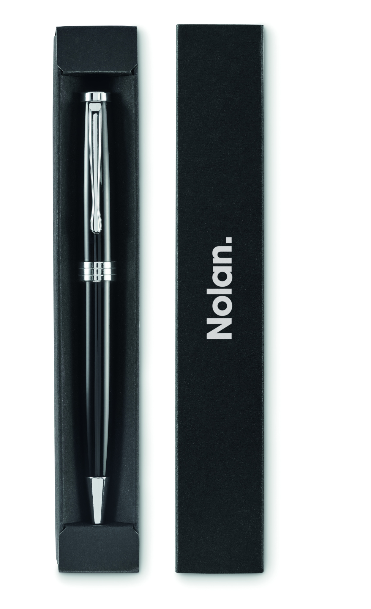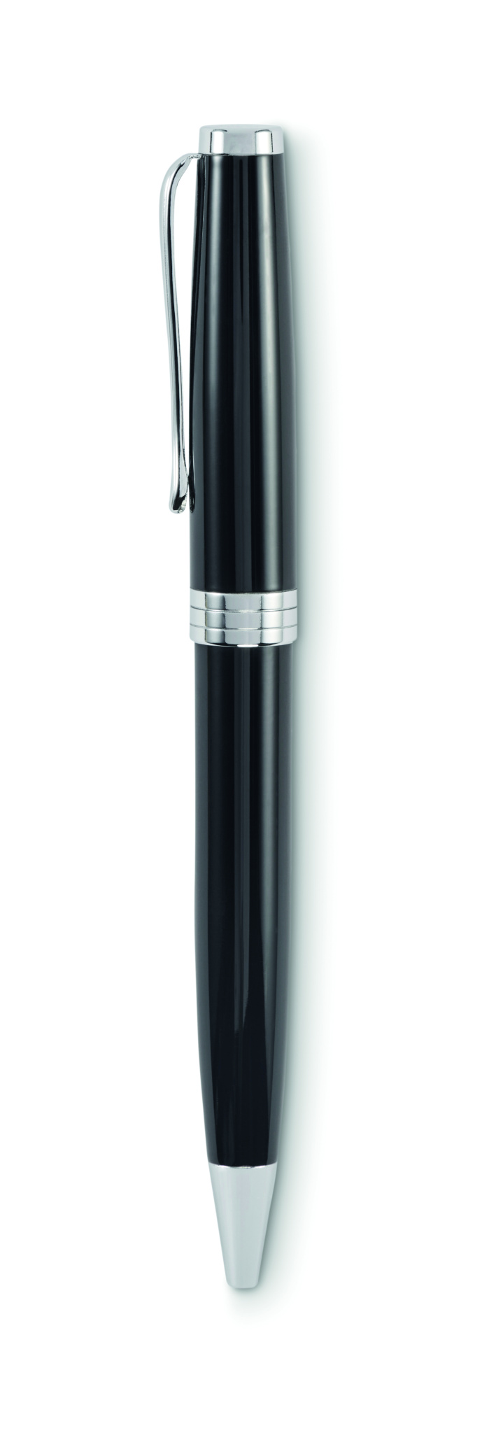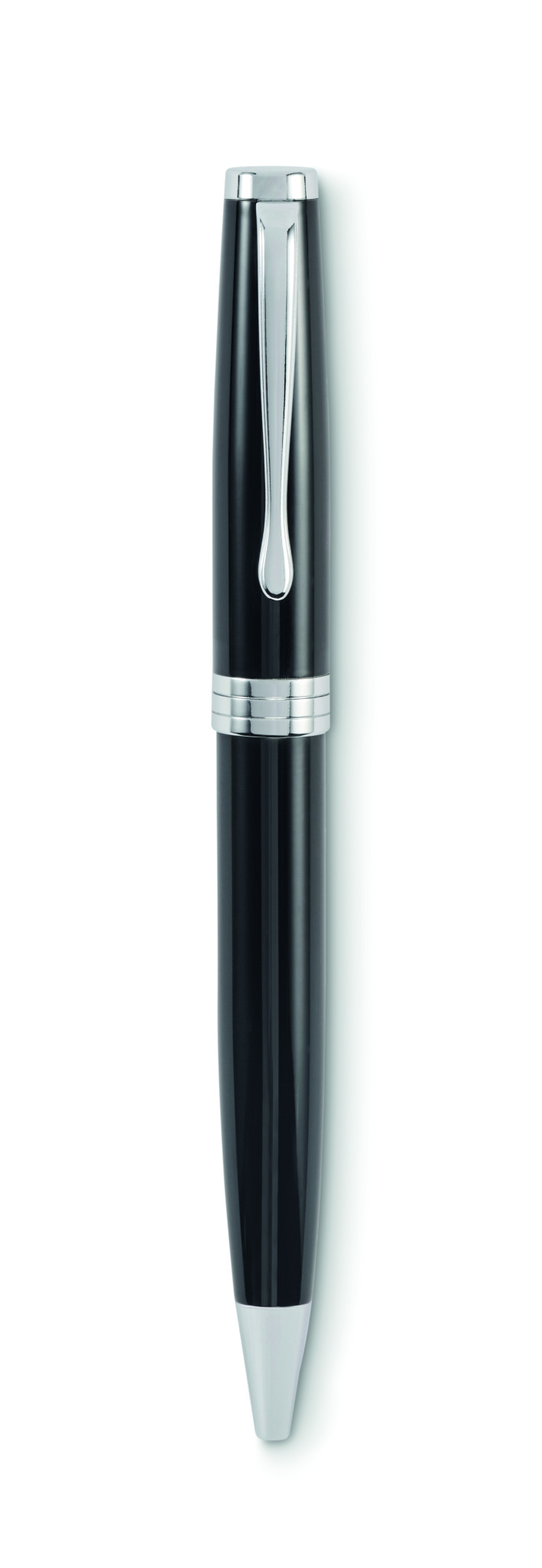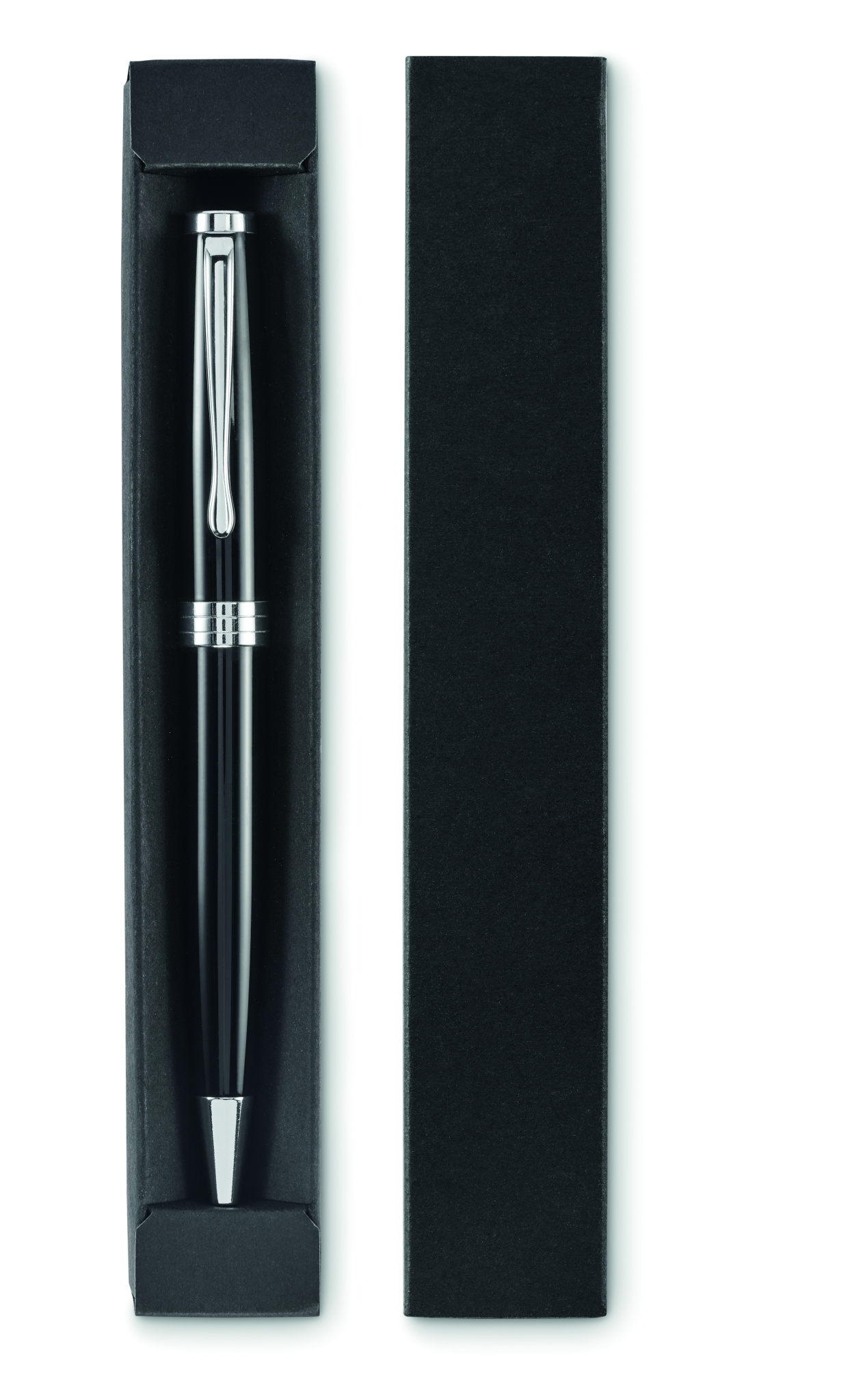 Kulspetspenna med vridfunktion och skaft i återvunnet rostfritt stål. Blått bläck. Levereras i svart låda.
