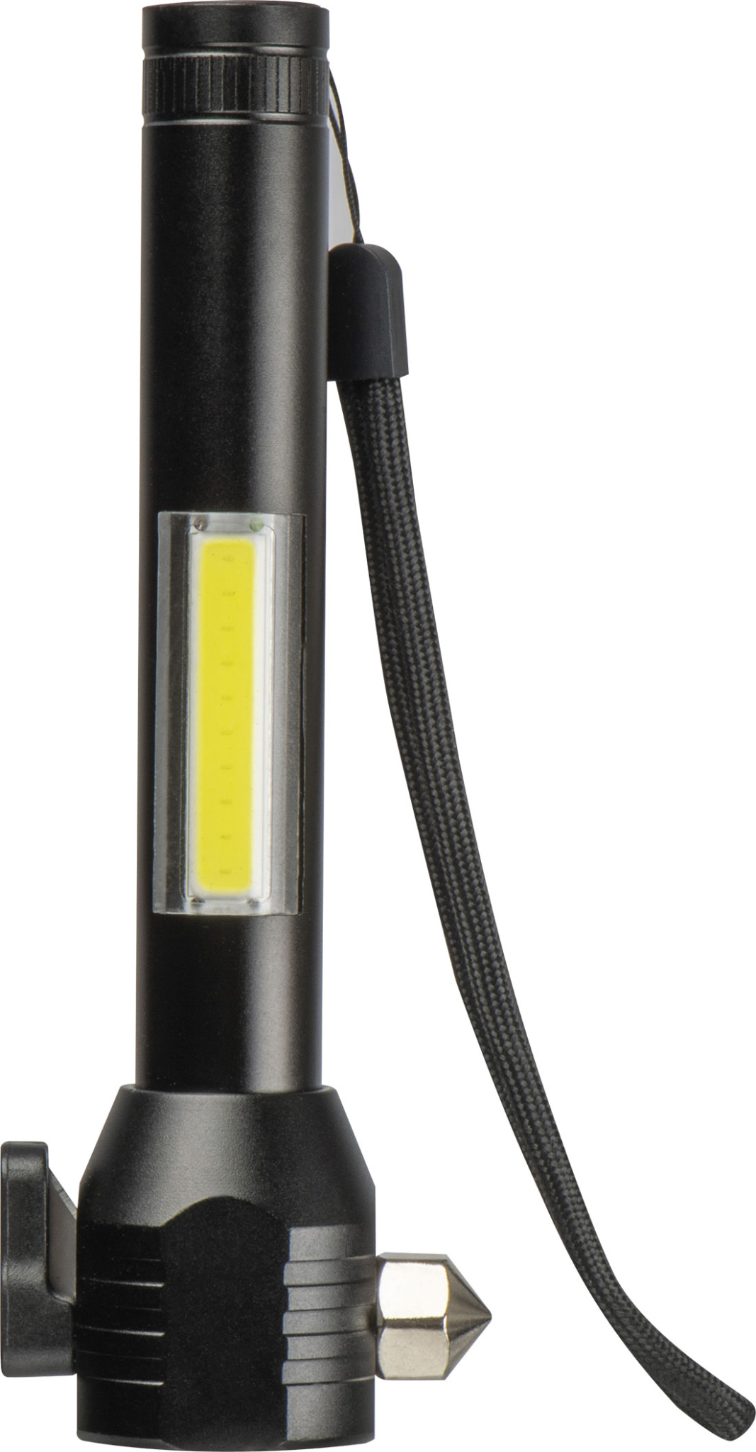 Multifunktionell, uppladdningsbar COB-ficklampa av aluminium. Ficklampan har ett 500 mAh batteri, en USB-C-laddningskabel, en säkerhetshammare, en säkerhetsbältesklippare, en handledsrem och en magnet för enkel montering.